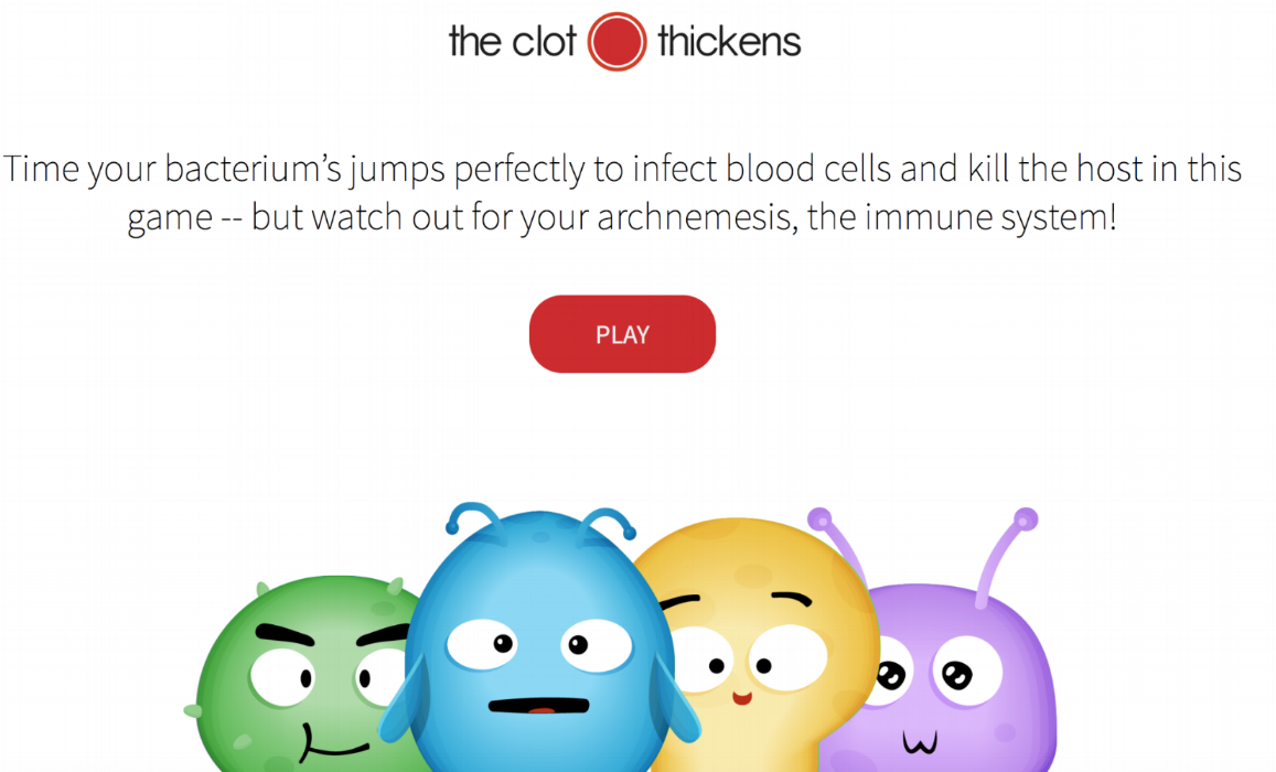 The Clot Thickens is a 10 level web game in which you play as a virus trying to take over your host, infecting the healthy cells and avoiding getting hit by antibiotics. You can play the game at: